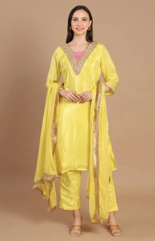 Brighten up every celebration with this stunning Yellow Festive Suit Set, designed to exude grace and charm. Crafted from a soft, flowy fabric with a subtle sheen, this ensemble offers both comfort and sophistication.