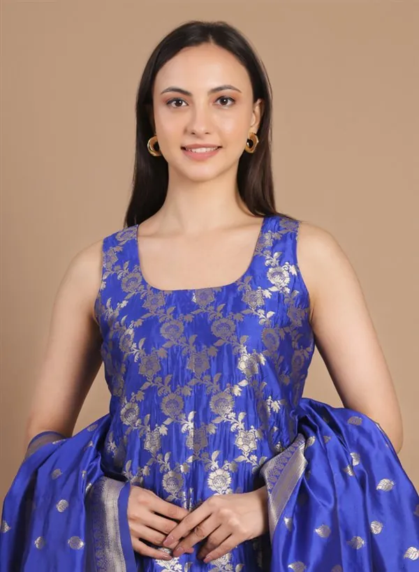 A celebration of heritage and grandeur, this royal blue silk ensemble is a timeless expression of traditional artistry. Woven with intricate gold zari motifs, the fabric reflects a luminous richness that embodies classic Indian elegance.