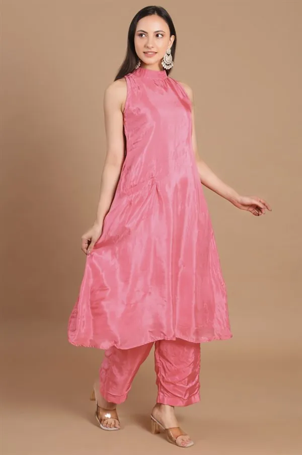 The sleeveless kurta features a stylish high neckline that adds a refined, contemporary touch. Its flowy A-line cut enhances movement while offering a flattering fit. Paired with matching straight-fit pants, this set strikes the perfect balance between minimal design and chic appeal.