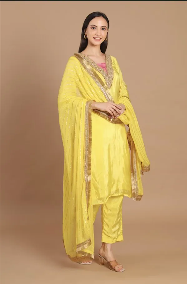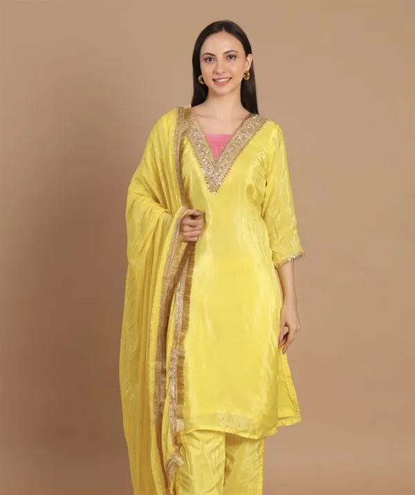 Brighten up every celebration with this stunning Yellow Festive Suit Set, designed to exude grace and charm. Crafted from a soft, flowy fabric with a subtle sheen, this ensemble offers both comfort and sophistication.